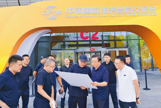 图为2023年8月28日,董亦军同志(前右二)在中国国际服务贸易交易会举办地,对交通服务保障工作进行现场踏勘。 北京市公安局供图